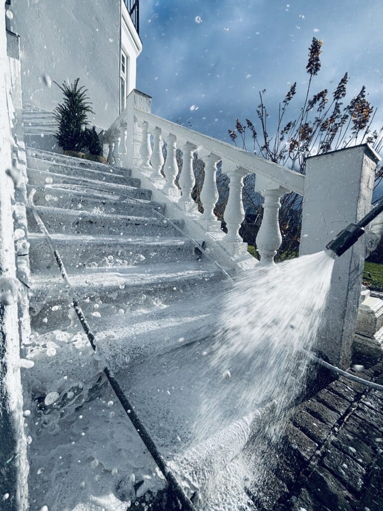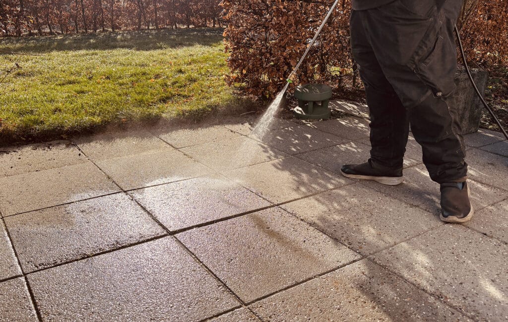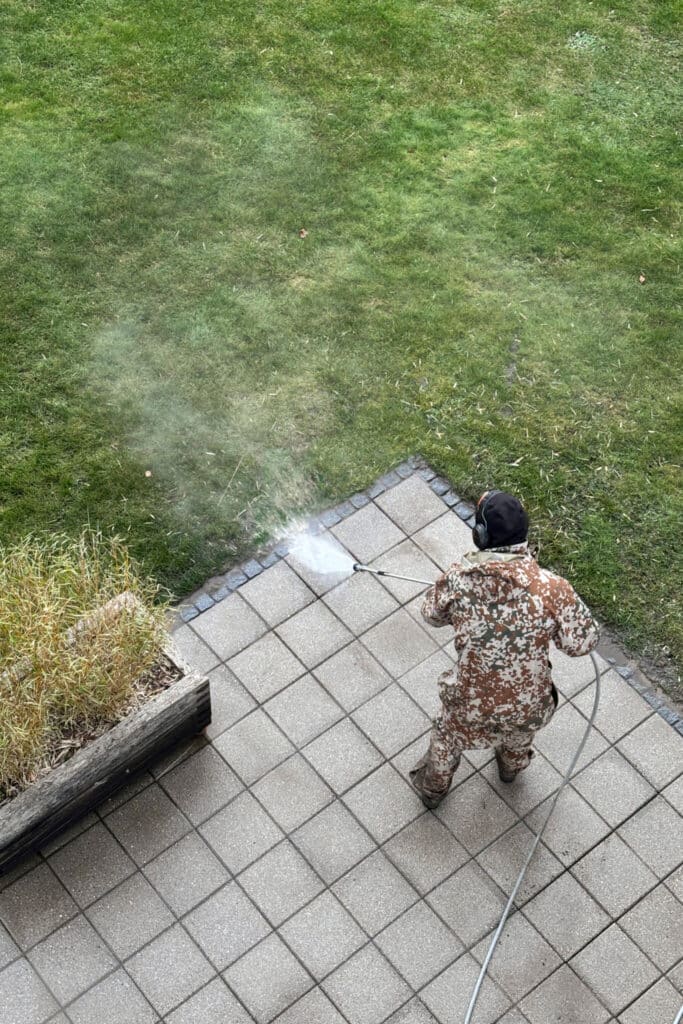 Vi går nu i gang med at desinficere og rense dine fliser grundigt ved hjælp af vores skånsomme overfladerenser. Her bruger vi udelukkende rent vand, som enten medbringes i vores bil eller tilkobles din vandforsyning. Rensningen fjerner effektivt flisepest, alger og mos, så din flisebelægning fremstår ren og velplejet.
